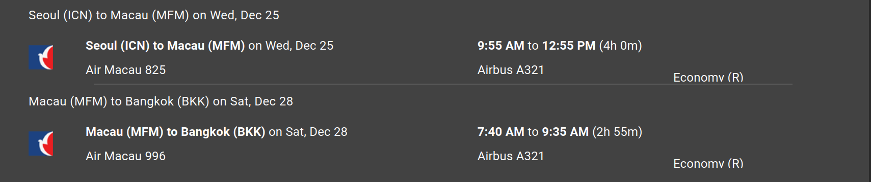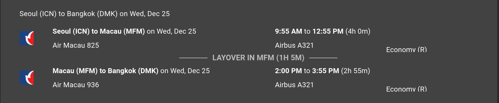 Flight iternary with Air Macau from ICN to DMK with a stopover at MFM