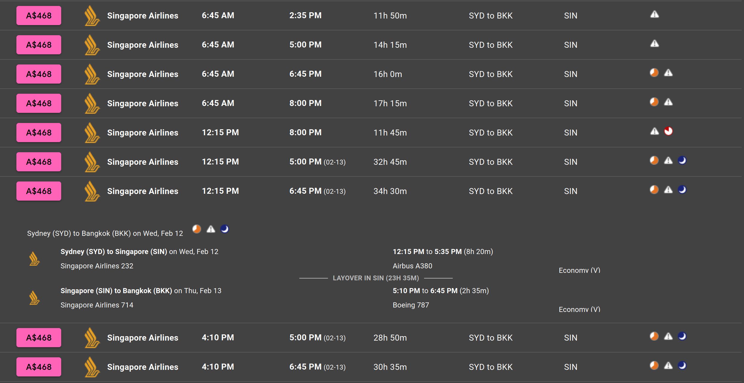 Based on the fare rule shown above, we can see that this trip only allows a transfer at SIN to connect to another SQ flight to BKK after we arrived on a SQ flight from SYD. To search for other available flights, we can use ITA Matrix to search again with routing code SQ+ (one or more flights on Singapore Airlines) and it gives the following alternative iternaries that share the same fare rule / price.