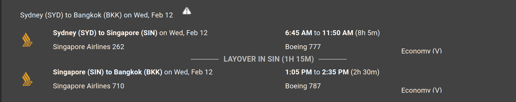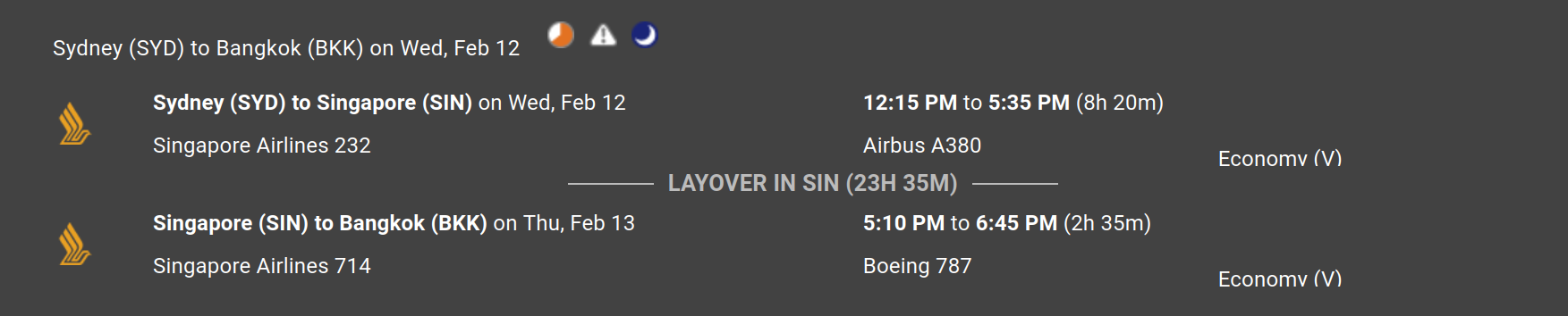 Flight iternary with Singapore Airlines from SYD to BKK on Feb 12th, 2025